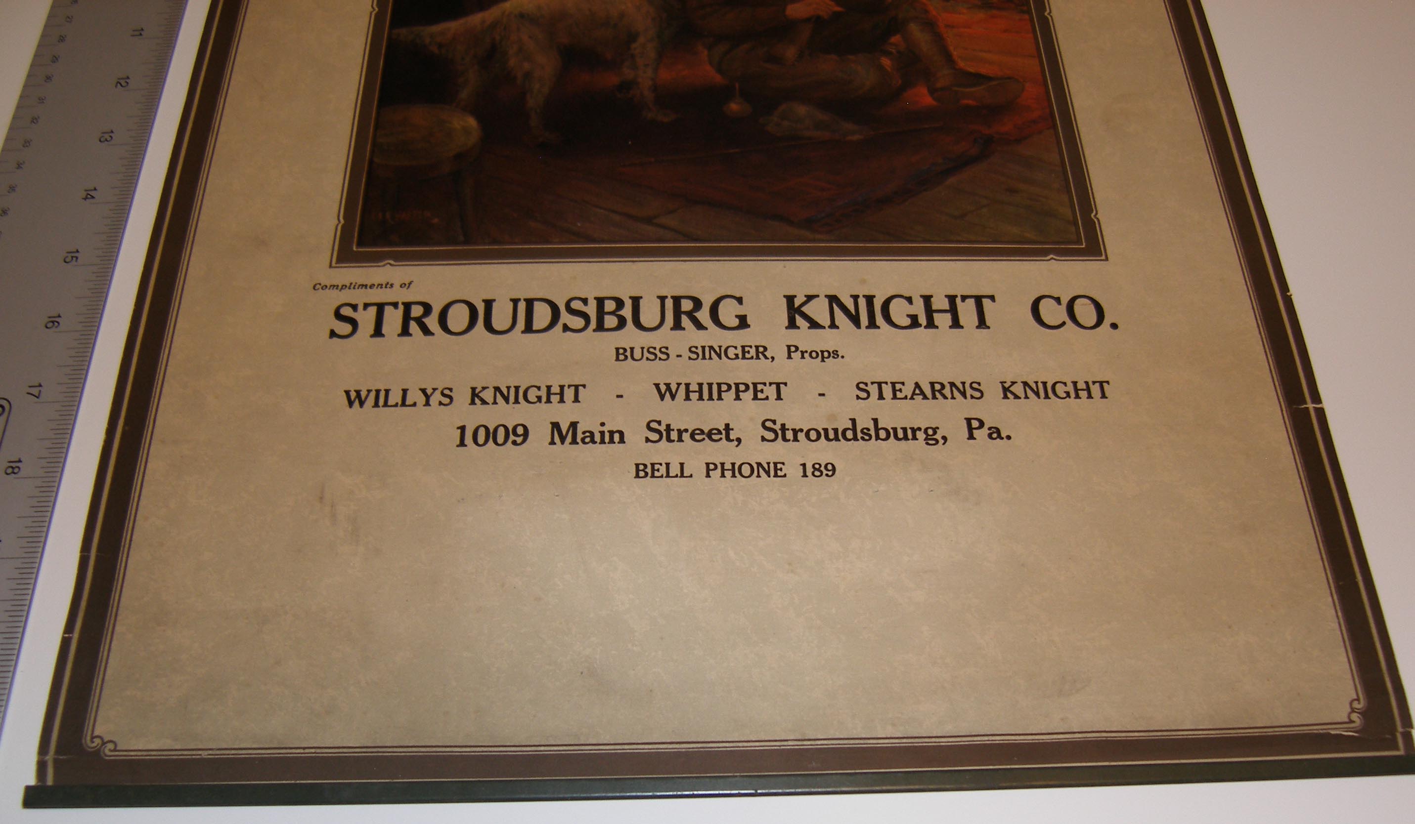 Circa 1926 AUTO adv STROUDSBURG KNIGHT Co Willys Whippet Hunter Shotgun dog fireplace lodge
