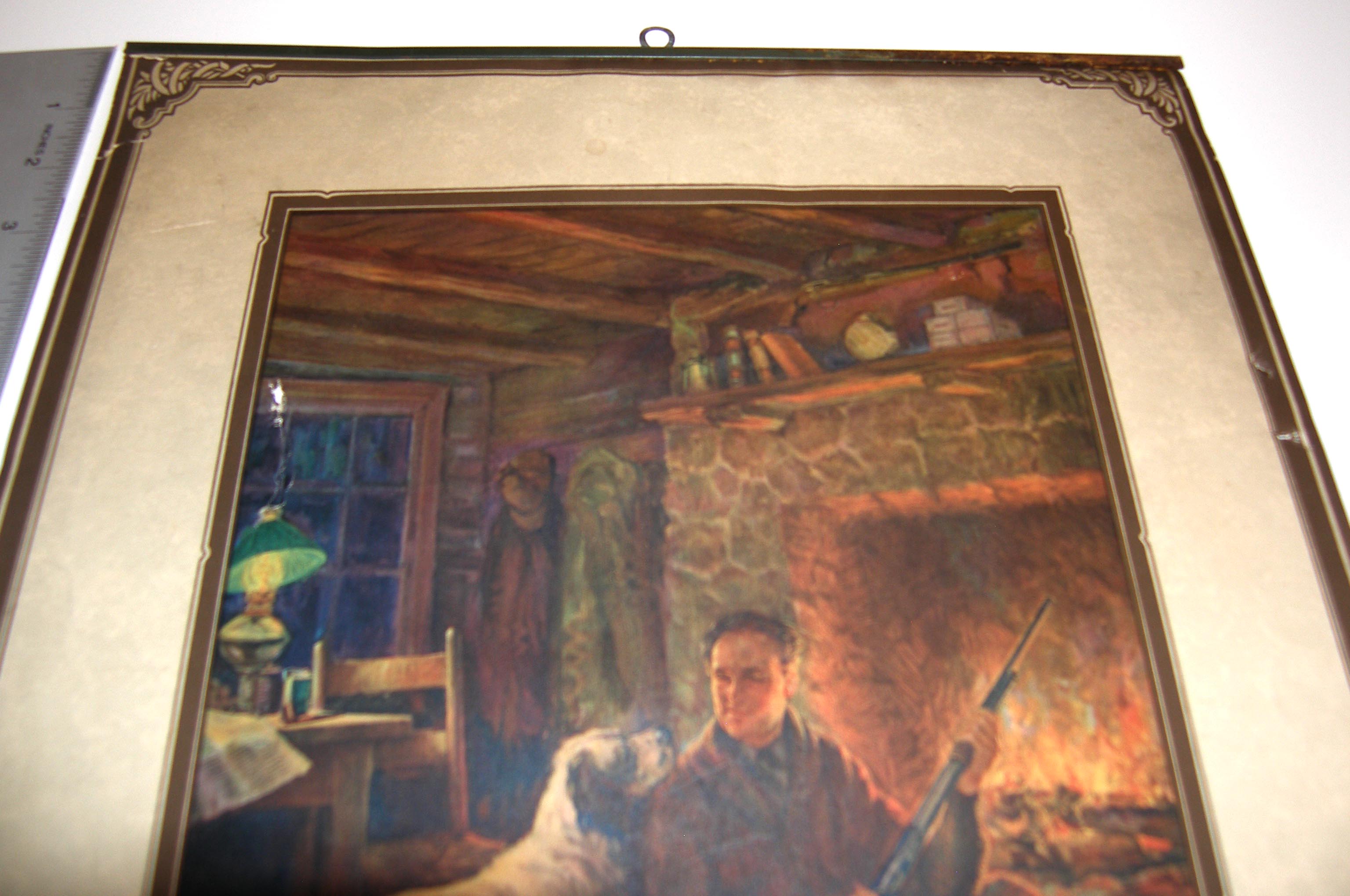 Hunter cleaning his shotgun dog by his side. Fireplace roaring. Reads Bus Buss - Singer Proprietors props 1009 Main Street Stroudsburg PA phone Bell Phone 189